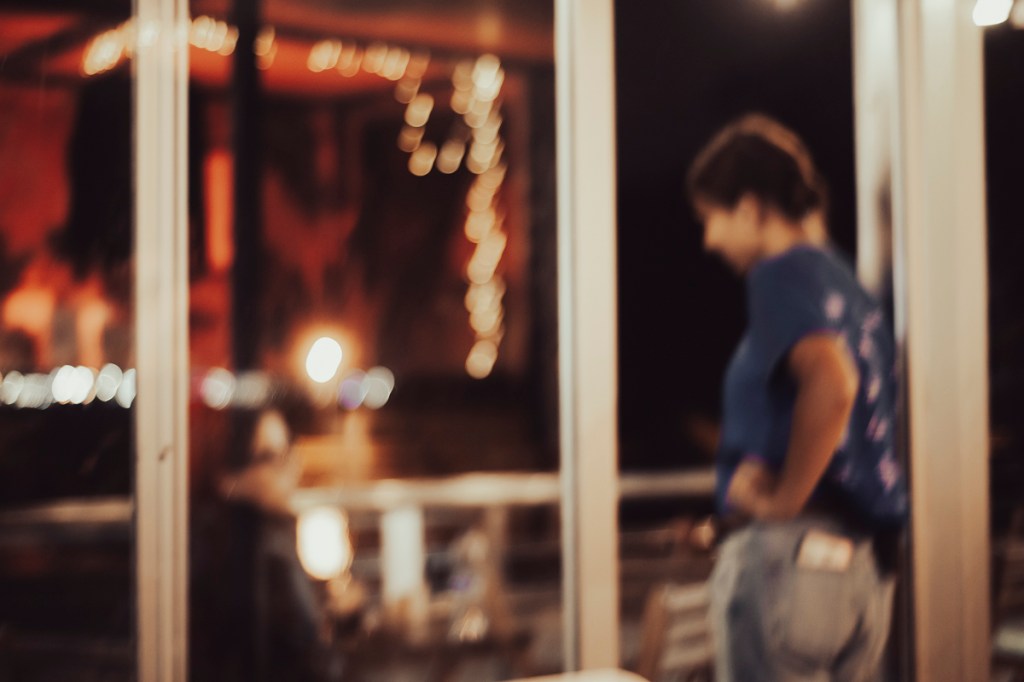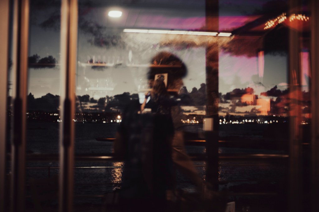 La hora dorada ya pasó, pero la magia permanece: el cristal de la terraza de este pequeño bar se convierte en la frontera entre la luz eléctrica y la oscuridad del mar. Es un juego de reflejos duplicados donde las luces interiores, las siluetas borrosas y los destellos se funden con el dramatismo de las nubes y las luces lejanas de la costa.